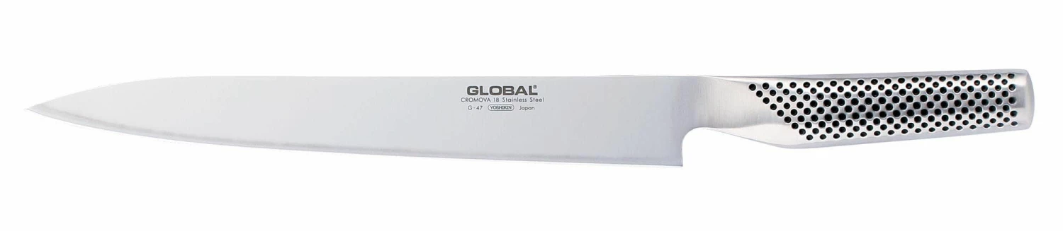 Double-beveled sashimi knife which has a long and very thin blade especially designed to prepare sashimi, sushi, sliced raw fish and seafood. The blade is purposely angled from one side and flat on the other. This allows sharper and more precision cutting and slicing from one side of the blade.