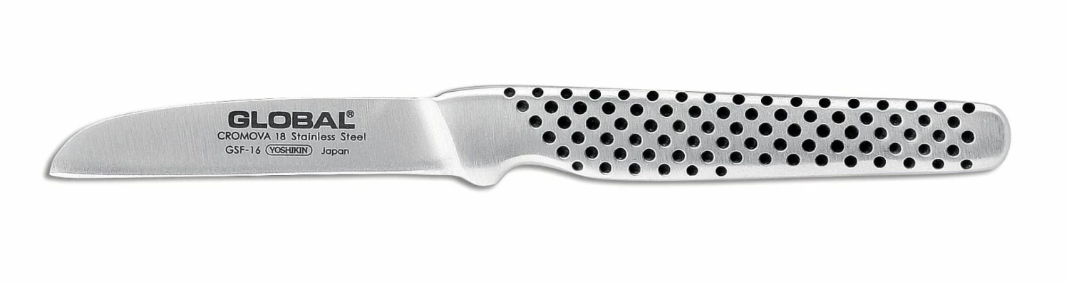 The perfect knife for peeling, paring and chopping smaller food items. It is also used to make a cut known as a tourné cut in vegetables such as carrots. It is a specialized type of paring knife. The GSF series is a collection of small, drop-forged knives for general and special preparation.