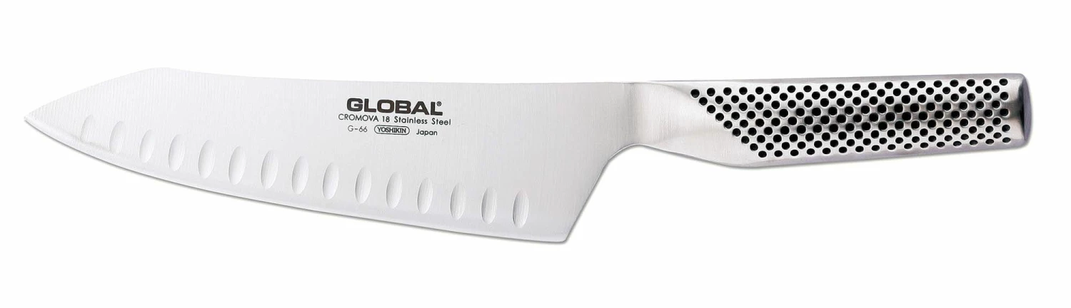 A knife that is a cross between a chef’s and a vegetable knife. The Asian Chef’s knife with hollow ground/granton edge is great for cutting meat, poultry, fish and vegetables. The scalloped grooves on the sides of the blade edge helps with reducing friction and sticking of foods.