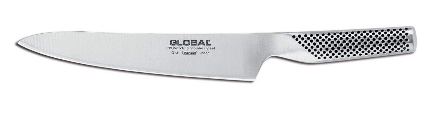 A carving knife is used to slice thin cuts of meat such as poultry, roasts, hams and other large cooked meats. The blade is thinner than a chef’s knife for more precise slices of meat.