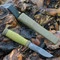 High-quality knife with a profile-ground, multifunctional blade as well as a patterned, high-friction grip handle. Blade of Swedish cold-rolled special stainless steel. Forest green plastic sheath with a flexible leather strap.